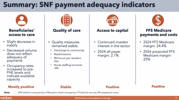 - In its January 2026 report, MedPAC recommended a 4% cut to Medicare SNF payments, pointing to indicators shown in the accompanying graphic, including increased occupancy, continued investor interest, and strong fee-for-service Medicare margins. The graphic highlights MedPAC’s conclusion that payment adequacy is mostly positive, even as supply has slightly declined and facilities report adequate capacity.