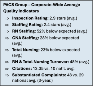 - The PACS Group — a rapidly expanding nursing home chain that has faced serious scrutiny over billing and compliance issues— recently announced record financial results, including a31% year-over-year revenue increase and $1.34 billion in quarterly revenue. Meanwhile, federal staffing data show troubling care indicators across PACS facilities: 95% provide less nursing staff than expected to meet resident needs, with registered nurse staffing averaging a whopping 52% below expected levels. The chain also shows significantly worse regulatory outcomes, with health citations 25% higher than the national average and an average of 48 substantiated complaints per facility (compared with a national average of 29) in the Provider Database.