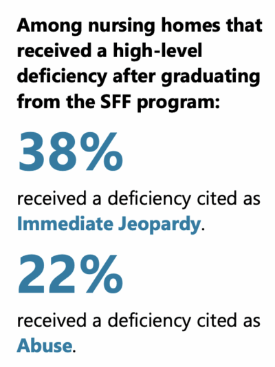 - OIG found that, while many facilities enrolled in the program “graduate,” a large share of those graduates quickly revert to serious quality-of-care deficiencies. In fact, nearly two-thirds of homes that exited the program between 2013 and 2022 showed the same kinds of problems that landed them in the program in the first place.